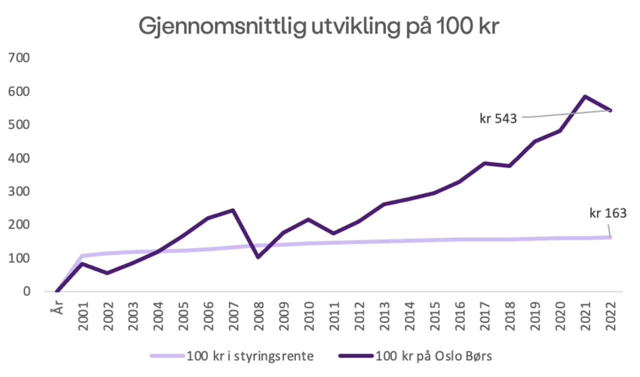 Dette er kun et begrenset utvalg uten dypere analyse, og det er bare 5 år den i gjennomsnitt har vært over dette tallet. Det jeg forsøker å si er vel at det er vanskelig å vite hva som vil skje i fremtiden, og markedet belønner som regel de late som holder seg til strategien. Forsøk på å time markedet vil ofte medføre at du kommer for sent inn igjen og ikke får med deg de virkelig gode dagene. Under ser du utviklingen om du hadde plassert 100 kr i gjennomsnittlig årlig styringsrente, mot å plassere 100 kr på Oslo Børs. Merk at vår anbefaling er at hovedvekten av investeringer er mot globale aksjer, og at denne grafen ikke er særlig egnet for beslutninger og er heller en kuriositet.