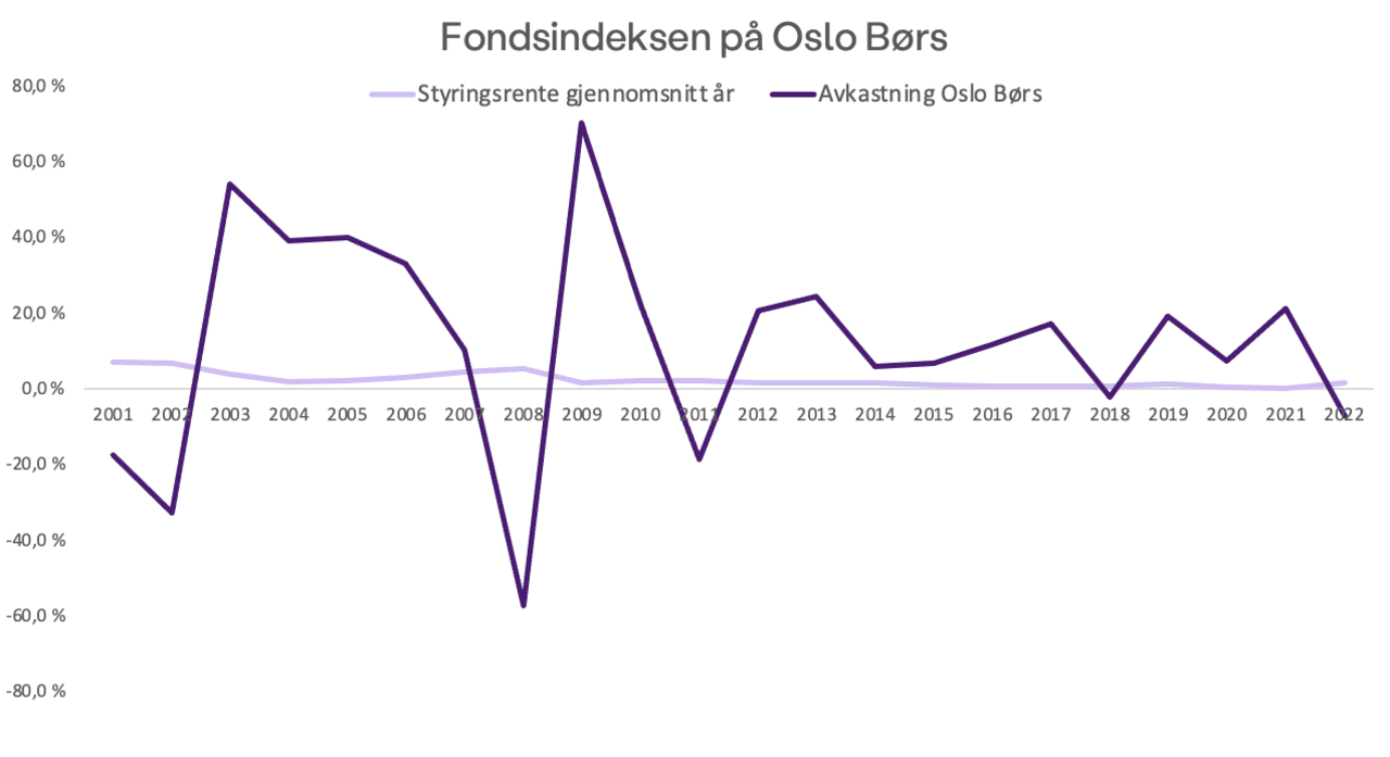 Akkurat som livet blir tøffere for deg når du får prisvekst og høyere lånerente, så treffer dette også bedriftene. Kapitalen de trenger koster dem mer å låne, og det er ikke sikkert at lommeboken til investorene er like åpne som før. Om vi ser på historien har fondsindeksen på Oslo Børs falt i 3 av 5 år når den gjennomsnittlige styringsrenten det året var over 3 %.